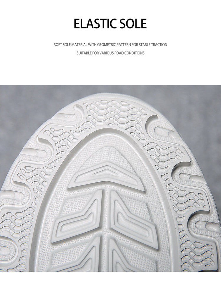 - The shoe's sole is elastic and soft, featuring geometric patterns for strong traction on various surfaces.